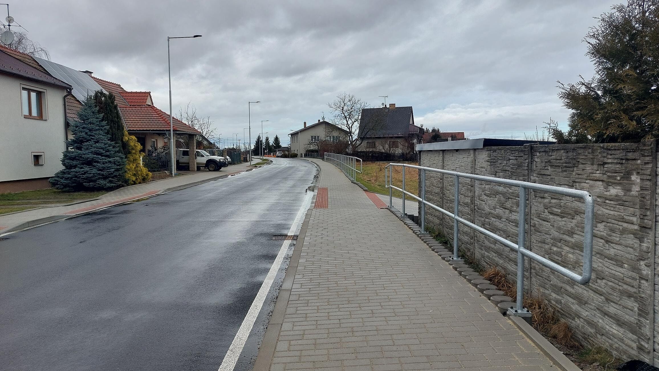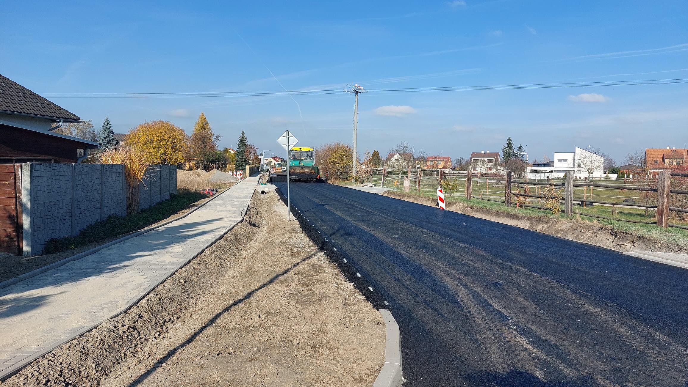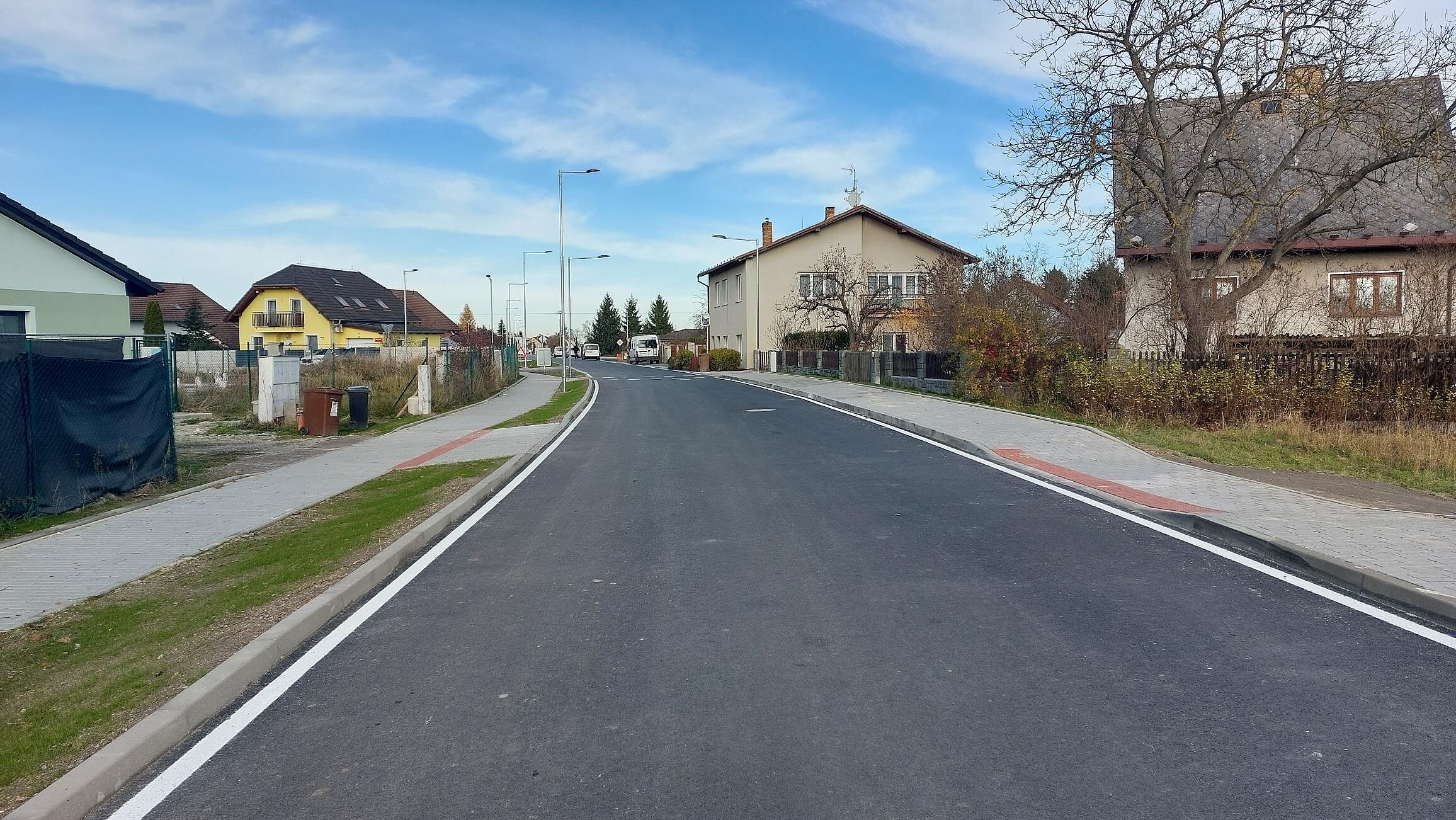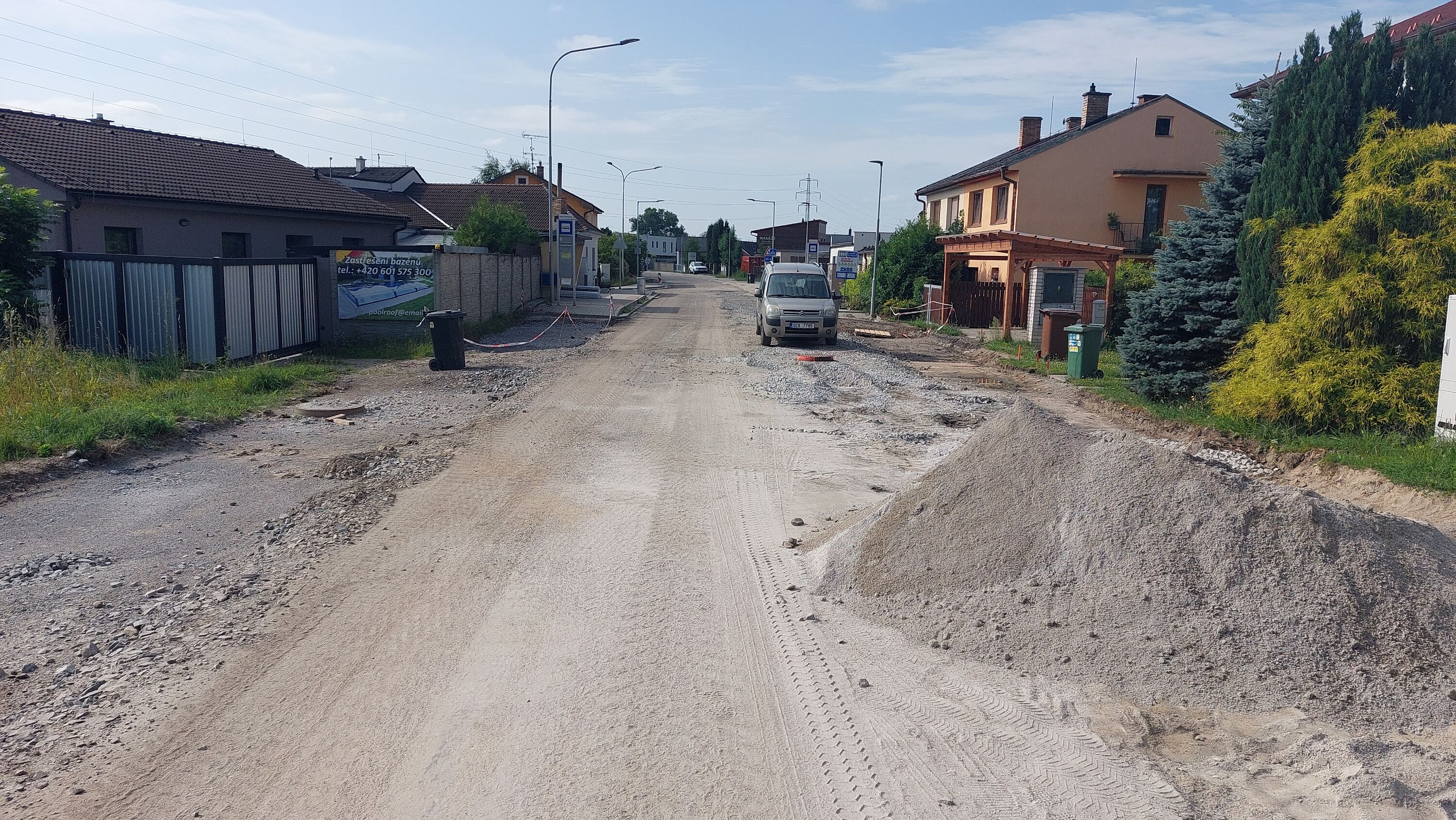 Rekonstrukce konstrukčních vrstev komunikace recyklací za studena, včetně vybudování chodníků a veřejného osvětlení (investor obec Roudné).